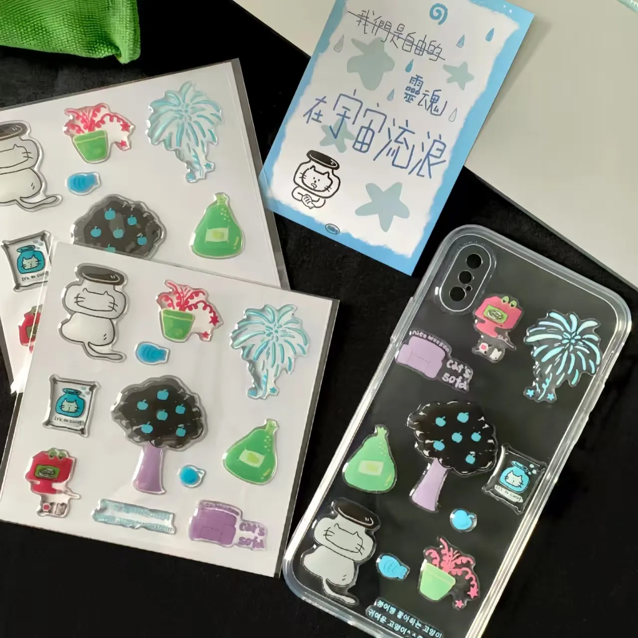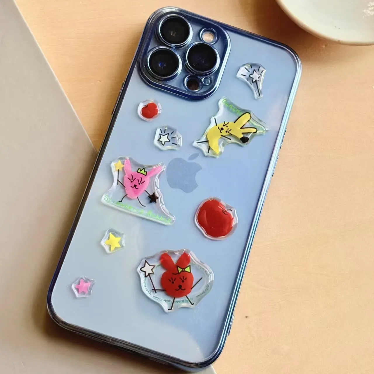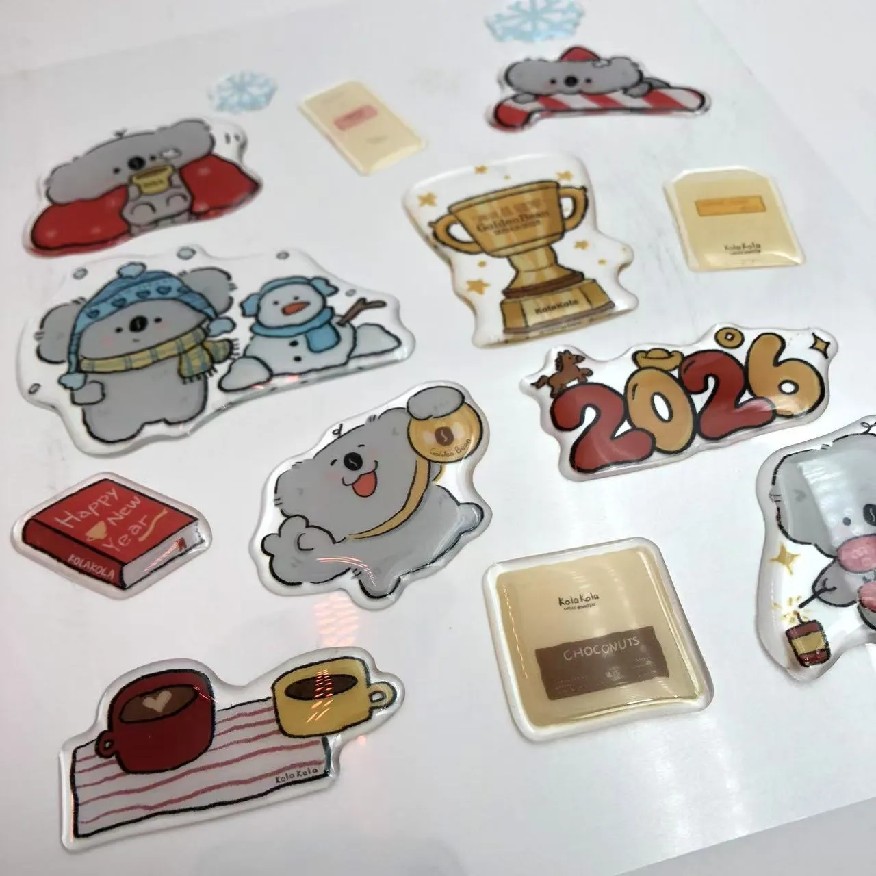 3D risane nalepke iz epoksi smoleso prilagojene 3D nalepke z dizajni na temo risank. Vsaka nalepka je prevlečena s plastjo visoko prosojne epoksidne smole, ki se utrjuje s postopkom kapljanja lepila, da se ustvari mehka, gladka in elastična dvignjena tekstura.