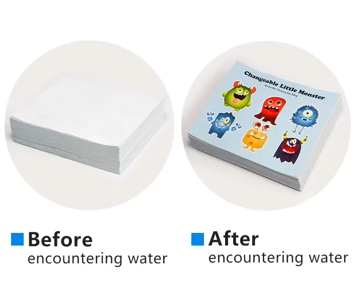 Ko ga potopimo v vodo, se takoj spremeni v pastozno stanje in se hitro razprši. Barve, natisnjene na njem, se nato ustrezno razširijo in deformirajo. Postopek spreminjanja barve je nepovraten. Ko je enkrat izpostavljen vodi, bo trajno pokazal barvo.