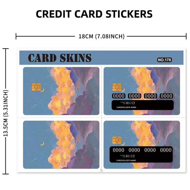 Nalepke s kreditnimi karticamiso personalizirane dekorativne nalepke, ki jih je mogoče zadržati na površini kreditnih kartic. Izdelani so iz ultra tankih in okolju prijaznih materialov in ne vplivajo na normalno potezo kartice ali odčitavanje čipa. Kreditne kartice ne omogoča le, da prikazujejo edinstven slog, ampak imajo nekateri izdelki tudi praktične funkcije, kot je anti-Swipe (RFID blokiranje), in hkrati prilagajanje logotipa. To je izdelek, ki združuje lepoto in praktičnost.
