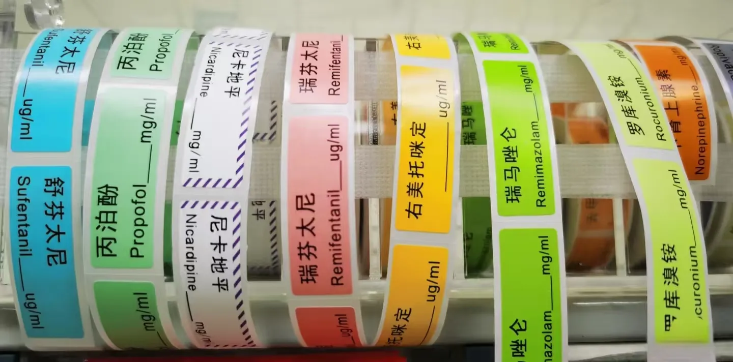 Samolepilne etikete, ki se večinoma uporabljajo na farmacevtski embalažioznake medicinskih zdravil, nalepke za tesnila in nalepke za brizge. Med vsemi samolepilniminalepke za zdravila, velik delež predstavlja uporaba samolepilnih nalepk za zdravila, sledijo samolepilne nalepke za zapiranje. Zdaj je del brizge začel uporabljati prozorne samolepilne nalepke BOPP za identifikacijo kalibracije. Farmacevtski izdelki v lepilni nalepki za steklenice so na splošno zrcalno premazan papir, premazan papir in mat papir s tremi vrstami površinskega materiala, prav tako imajo del etikete, ki se ne suši, uporabo papirnega materiala iz aluminijaste folije. Glede na premer ohišja steklenice, ki ga je treba etiketirati, je treba uporabiti samolepilne etikete različnih tež in različnih materialov sprednje strani.