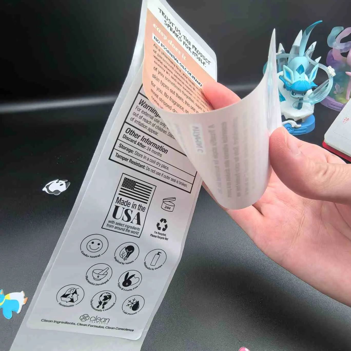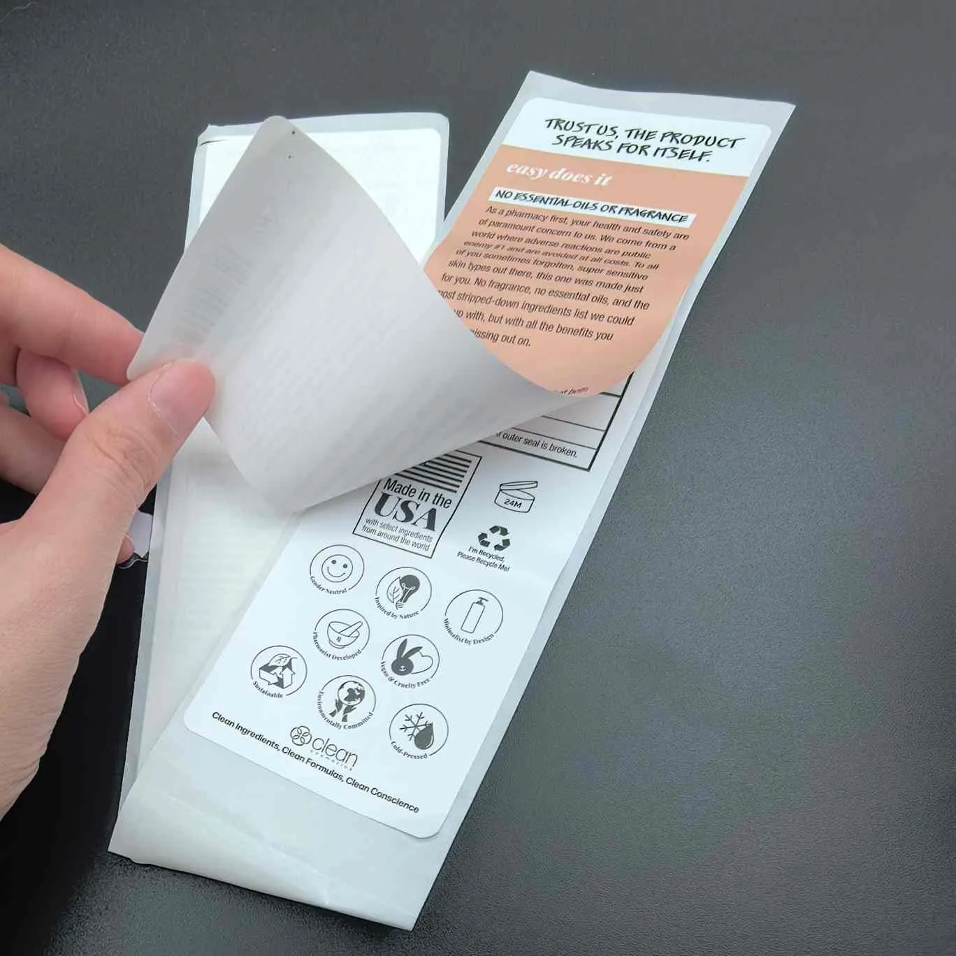 Odlepite in preberite etikete:Najosnovnejša vrsta. Imenuje se tudi večplastna za kozmetične etikete. Zgornjo plast je enostavno odlepiti, notranja plast pa vsebuje razširjene informacije. Pogosto se uporablja za obrazne maske, serume in druge izdelke v majhnih pakiranjih.