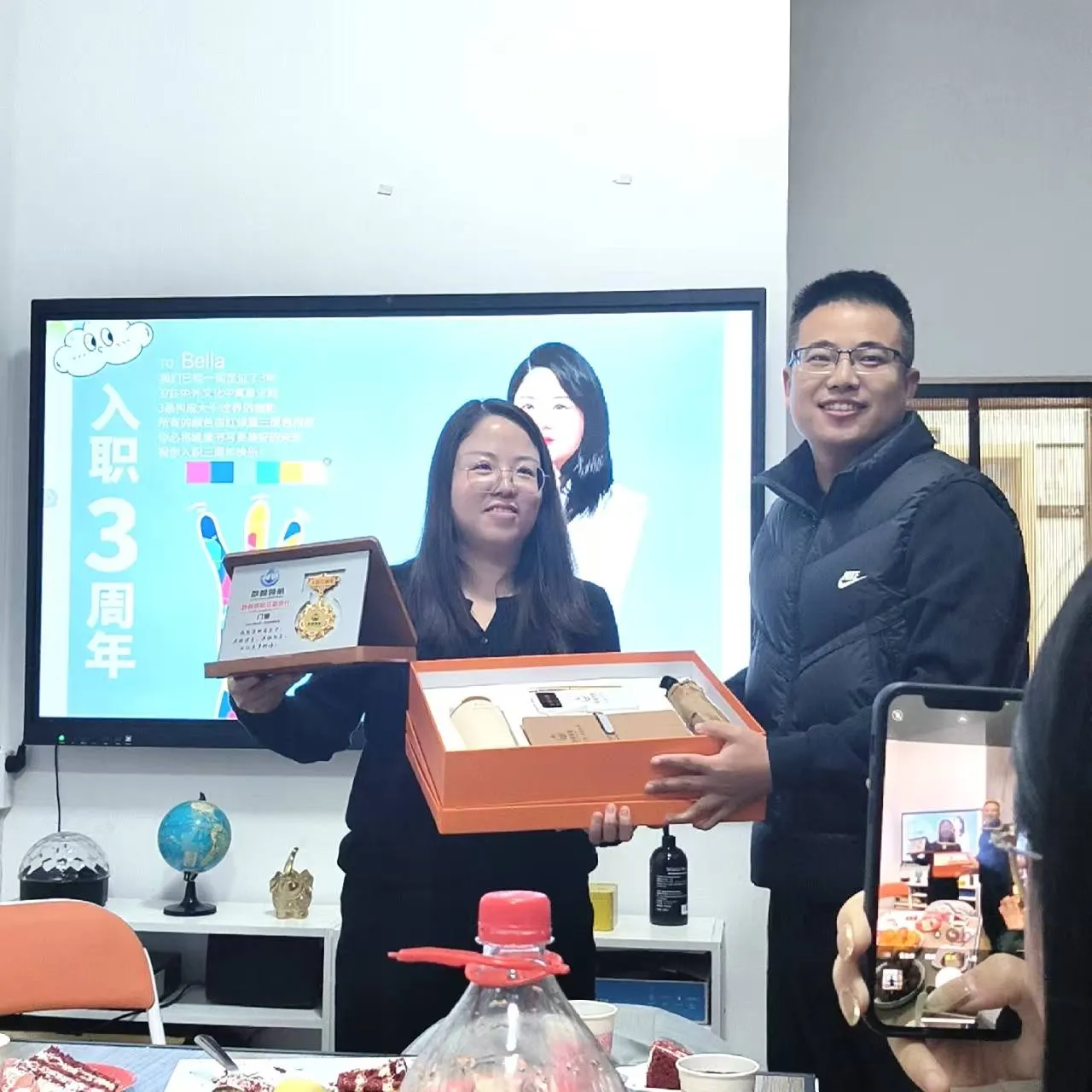 Kot čudovito presenečenje je šef Gao tudi osebno podaril čudovita darila za obletnico dela Tomu in Elli ter vodji Belli. Ti posebni žetoni so iskreno priznanje njihovim prispevkom v preteklih letih in prinašajo naše najboljše želje za njihovo nadaljnjo rast s podjetjem.