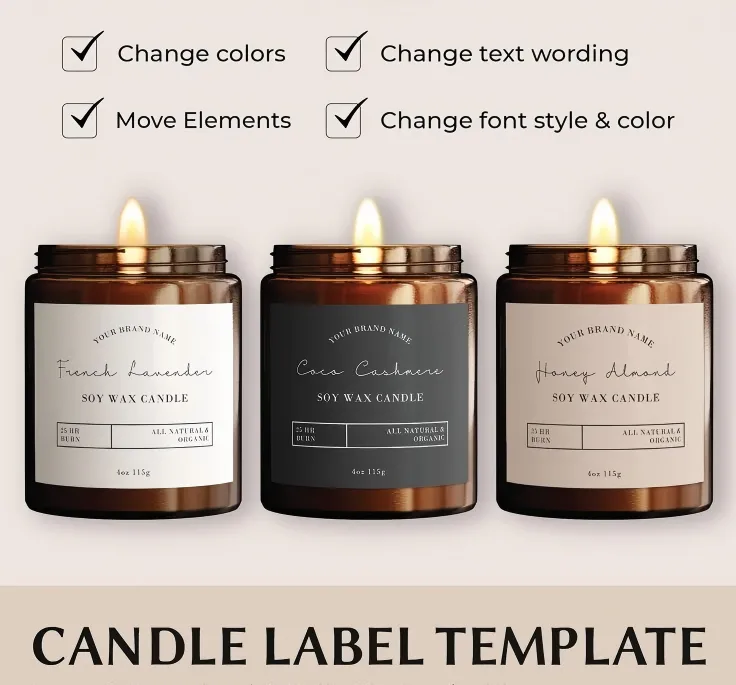 PVC:Ponuja odlično vzdržljivost in odpornost na vremenske vplive. PVC nalepke za dišeče sveče so lahko prozorne ali barvne. Upoštevajte, da PVC ni biološko razgradljiv, zato morda ne ustreza okolju prijaznim blagovnim znamkam.