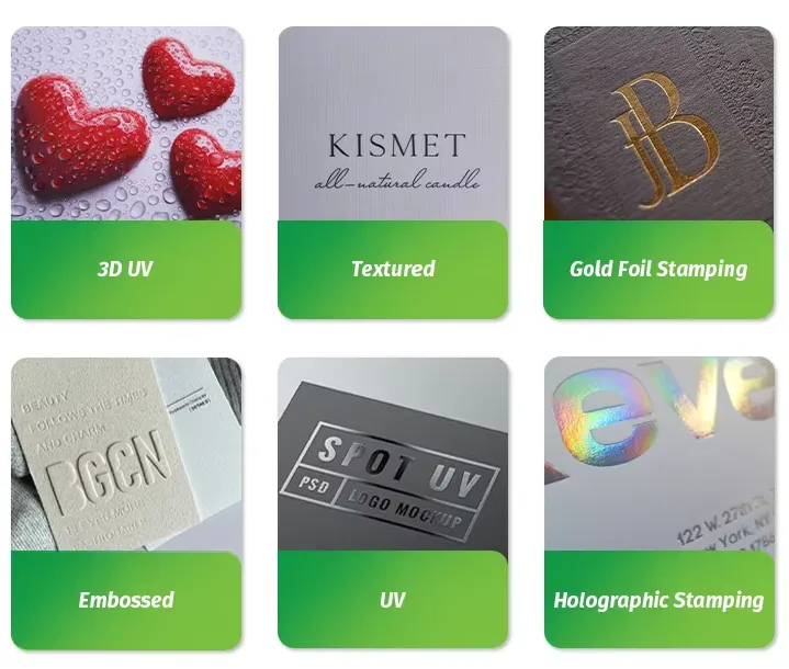 Vtiskovanje: ustvari dvignjene tridimenzionalne vzorce ali besedilo na nalepkah dišečih sveč. Doda teksturo in otipljiv element, zaradi česar so nalepke dišečih sveč bolj privlačne na dotik. Vtiskovanje se dobro obnese z logotipi ali okrasnimi motivi, kar poveča vrhunski občutek.