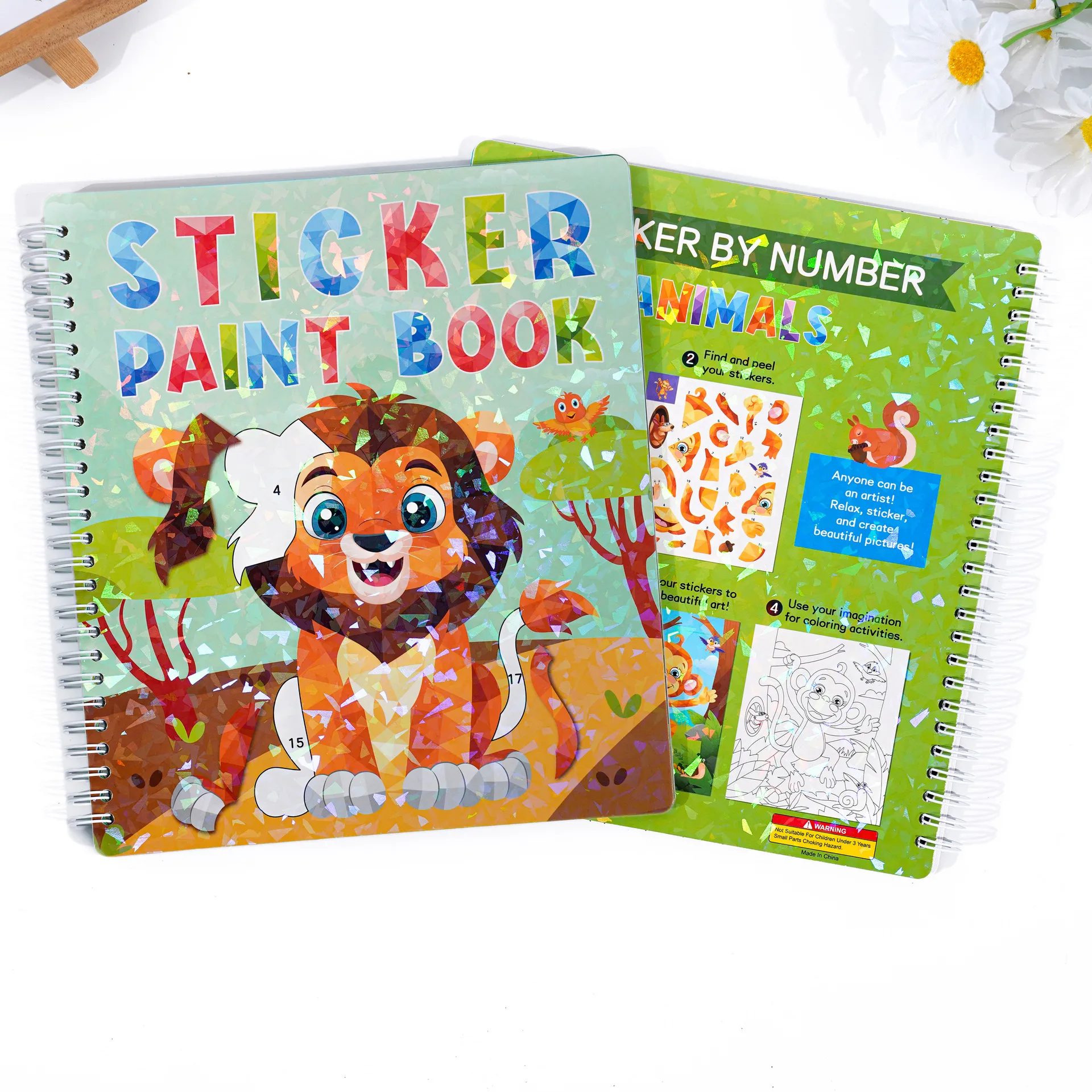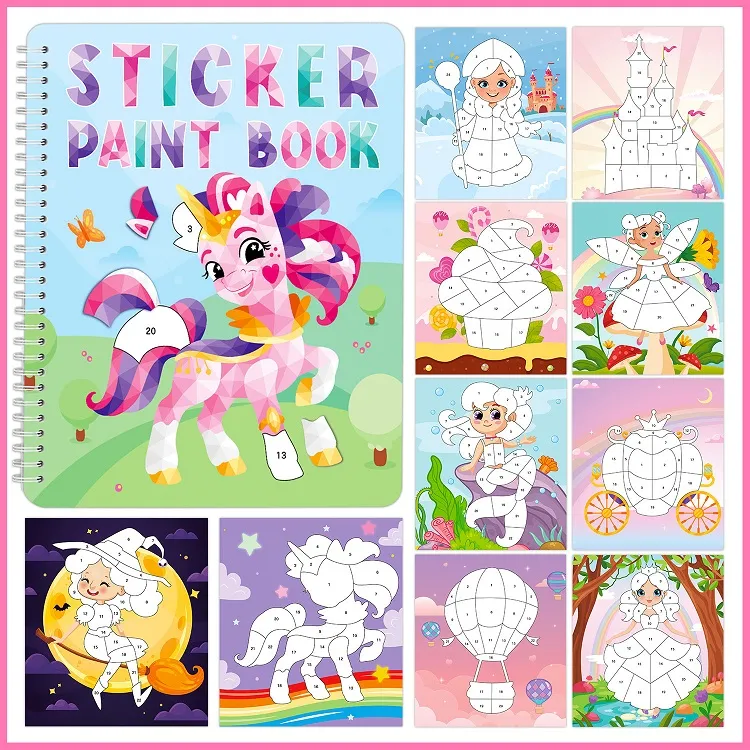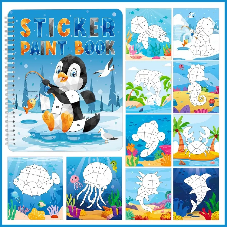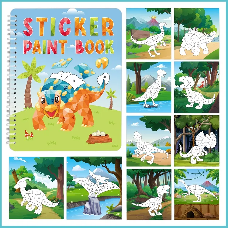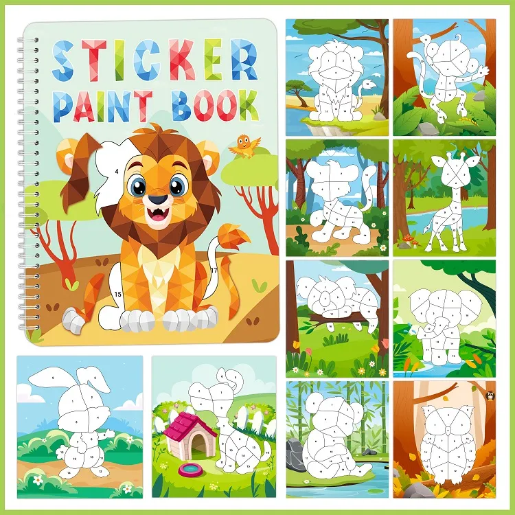 Knjige za nalepke pokrivajo različne teme, kot so risanke, živali in rastline; Slike vključujejo preproste skice, ustvarjalne teme in življenjske prizore.